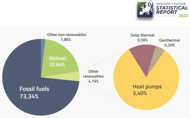 Ένα δεδομένο το οποίο δεν είναι ευρέως γνωστό στο σύγχρονο ενεργειακό τοπίο, ειδικότερα μάλιστα στον τομέα παραγωγής και κατανάλωσης θερμότητας, είναι ότι η ενέργεια από βιομάζα αποτελεί την σημαντικότερη ανανεώσιμη πηγή ενέργειας. Σύμφωνα με τα στοιχεία του Ευρωπαϊκού Συνδέσμου Βιοενέργειας “Bioenergy Europe”, στα περισσότερα κράτη – μέλη της Ε.Ε. η βιοθερμότητα (δηλ. η παραγωγή θερμότητας από στερεά, υγρά και αέρια καύσιμα και το βιογενές κλάσμα των αποβλήτων) αποτελεί τουλάχιστον τα δύο τρίτα του συνόλου των ανανεώσιμων πηγών ενέργειας στον τομέα θέρμανσης, ενώ οι υπόλοιπες ανανεώσιμες πηγές εκτός βιοθερμότητας (συμπεριλαμβανομένων των αντλιών θερμότητας) αντιπροσωπεύουν ένα πολύ μικρότερο μερίδιο στην ανανεώσιμη θερμότητα (βλ. Γράφημα 1).