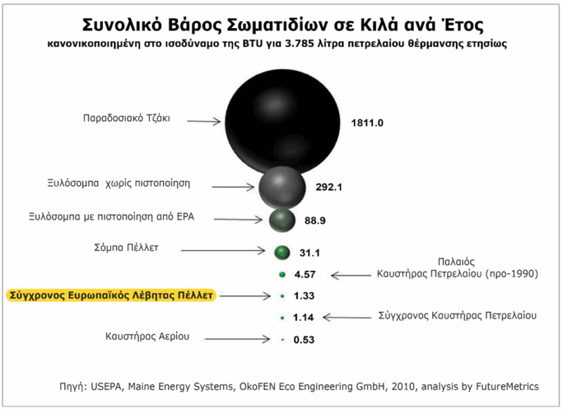 Με δεδομένο ότι ένα σημαντικό μέρος του αποθέματος συσκευών θέρμανσης σε ολόκληρη την Ε.Ε., αλλά και στην Ελλάδα ειδικότερα, είναι τουλάχιστον 30ετίας, οι σύγχρονες πιστοποιημένες συσκευές θέρμανσης με πέλλετ αποτελούν μία ενεργειακά αποδοτική και φιλική προς το περιβάλλον λύση, με πολύ χαμηλότερες εκπομπές αέριων ρύπων συγκριτικά με τις συμβατικές εστίες ανοικτού τύπου και χαμηλού βαθμού απόδοσης που καταναλώνουν καυσόξυλα, αλλά και με παλαιά συστήματα λέβητα-καυστήρα πετρελαίου (βλ. Γράφημα 3). Η δε τέφρα που αφήνουν, ως υπόλειμμα της καύσης τους, είναι ελάχιστη και μπορεί να ανακυκλωθεί.
